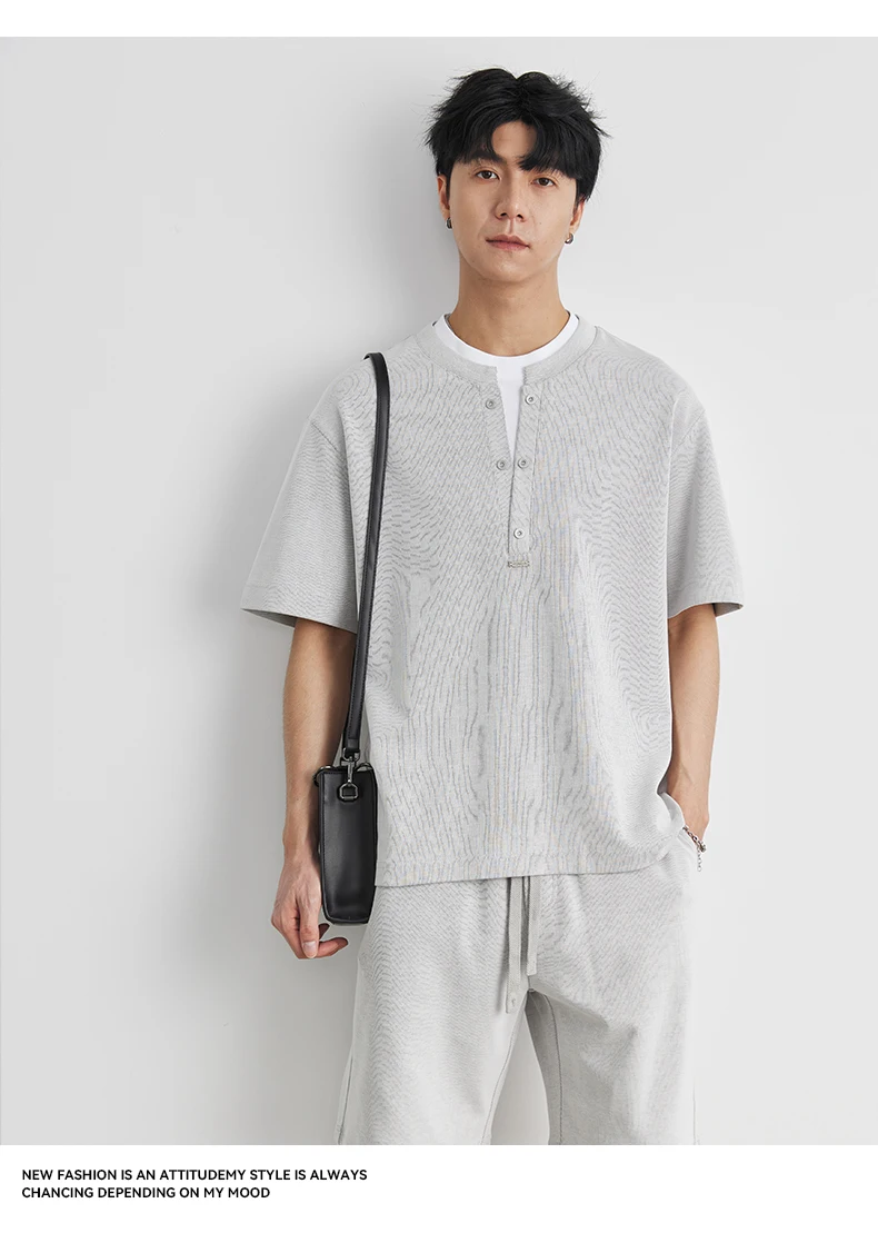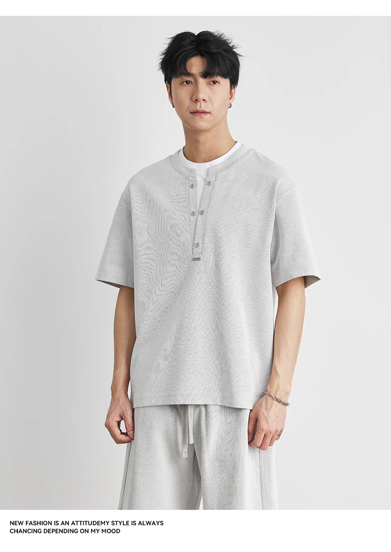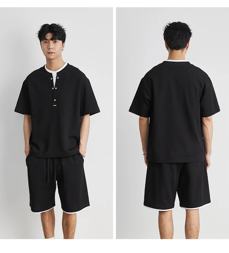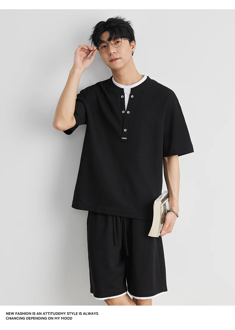 2025 New Men's Sports Suit Henry Collar Two-piece Casual Outdoor Loose Short Sleeve Shorts Fashion Korean Men's Summer Suit