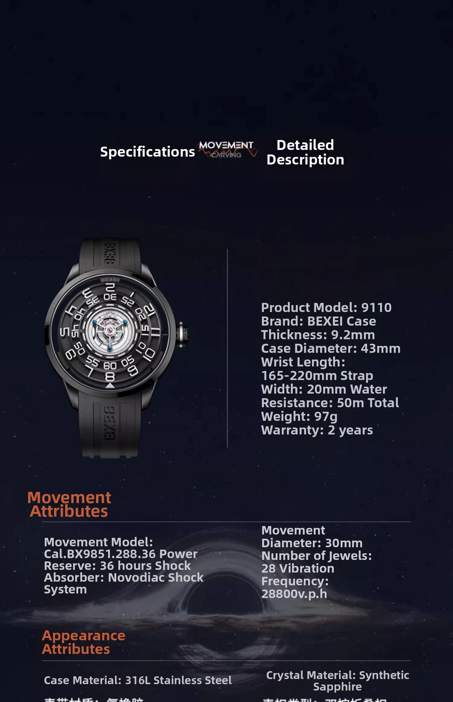 BEXEI 2025 skeleton synthetic sapphire manual tourbillon mechanical movement wrist watch for men Luxury waterproof Reserve 36H