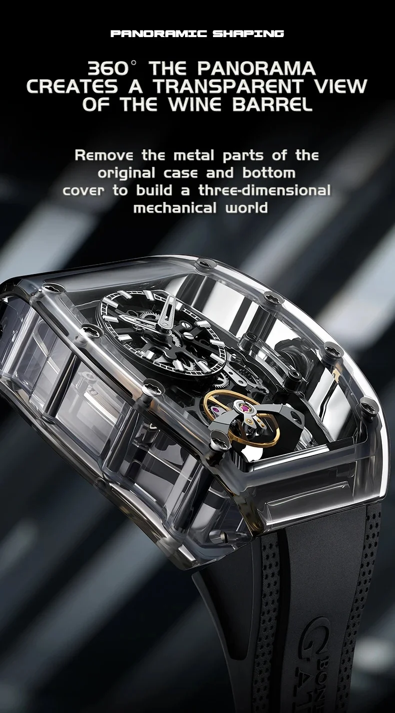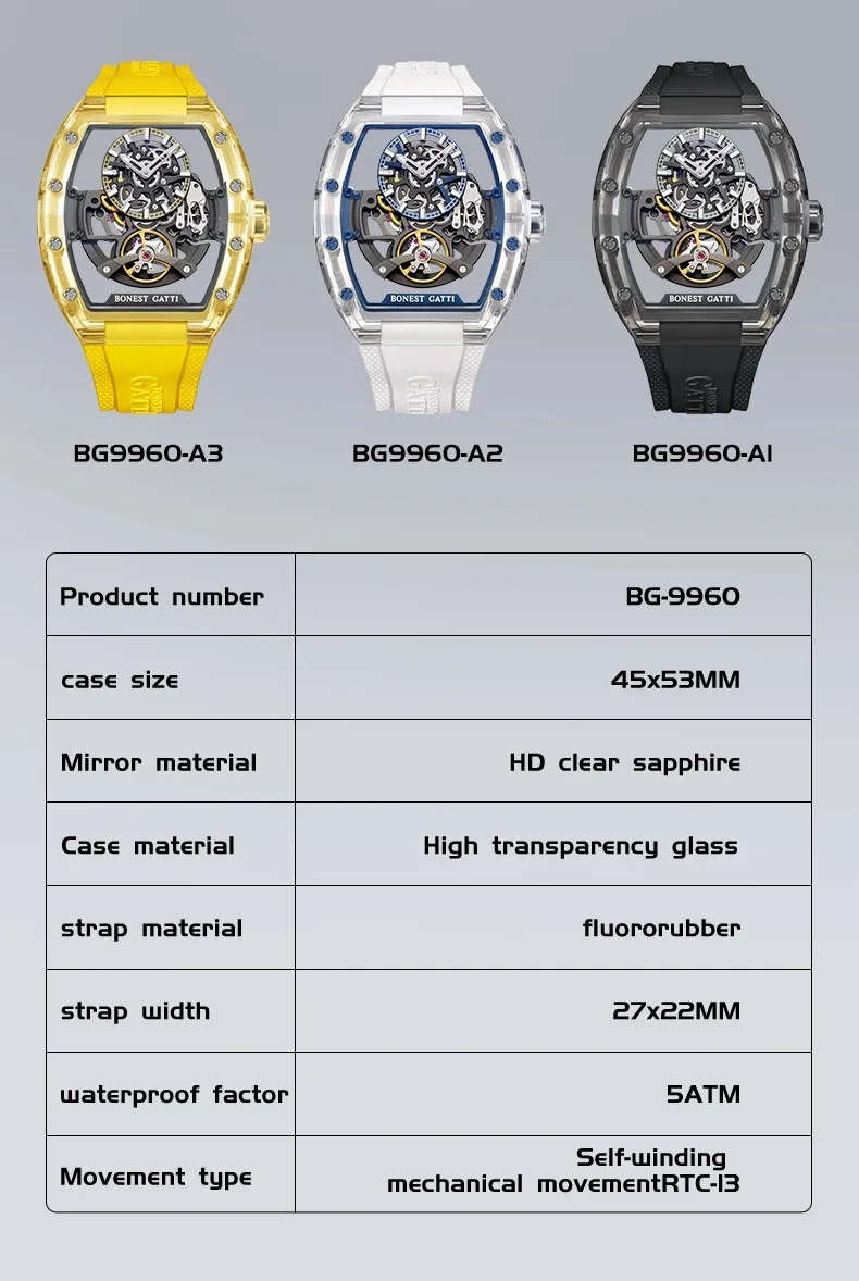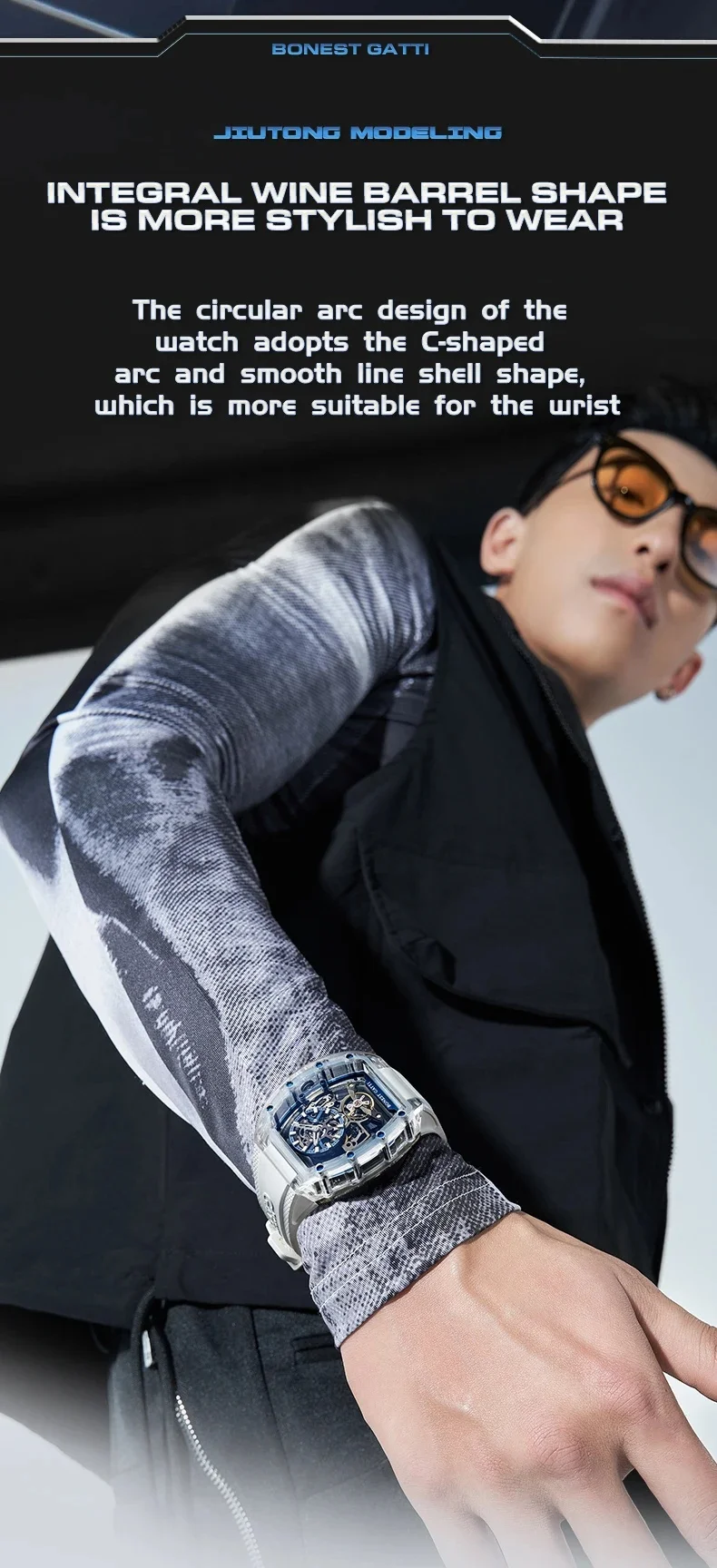 BONEST GATTI 2025 New Men Automatic Watch Tonneau Mechanical Wristwatch Acylic Case Sapphire Lume Hollow Out Dial Fluororubber