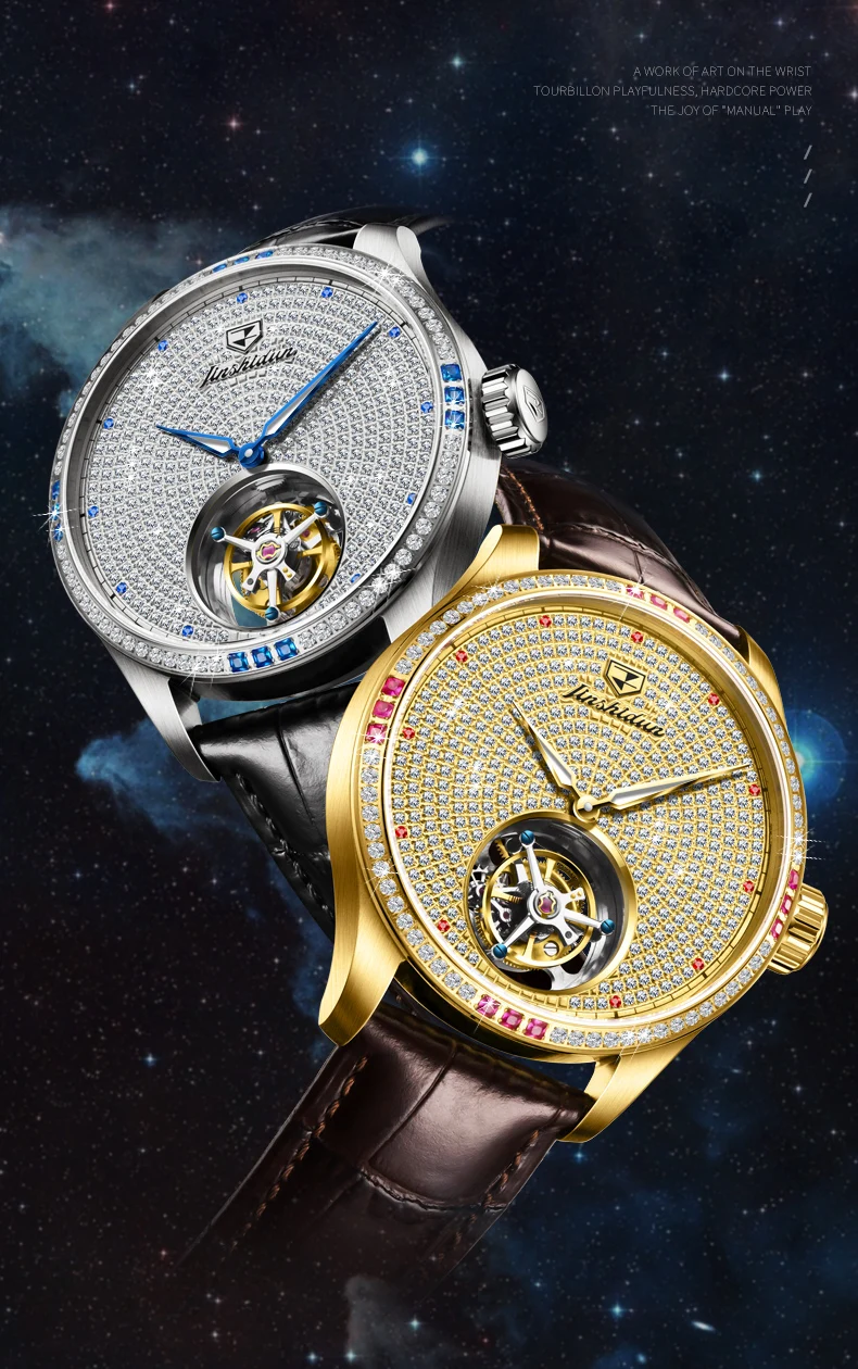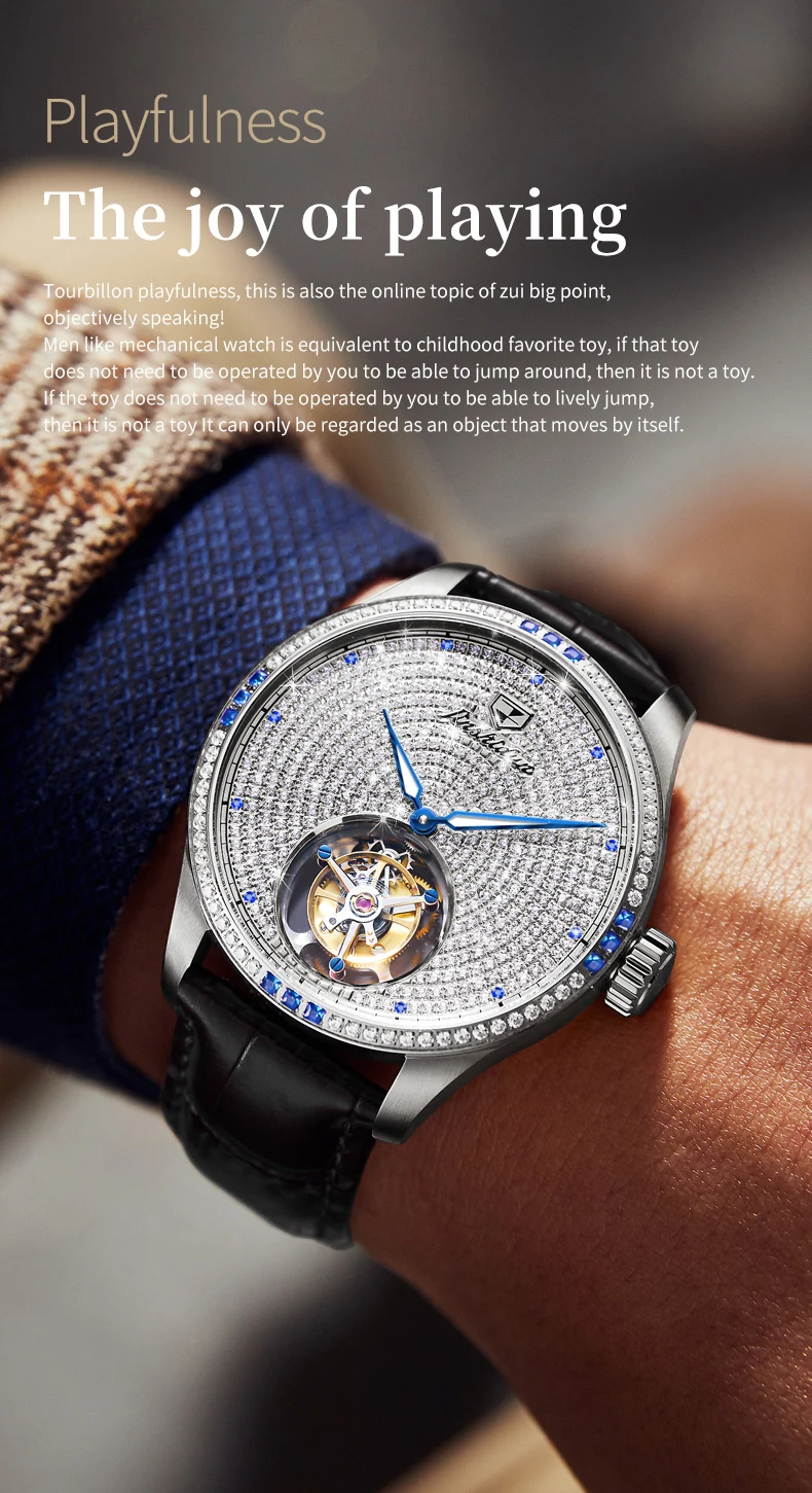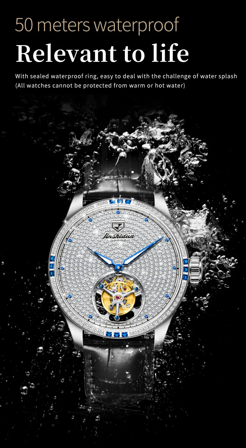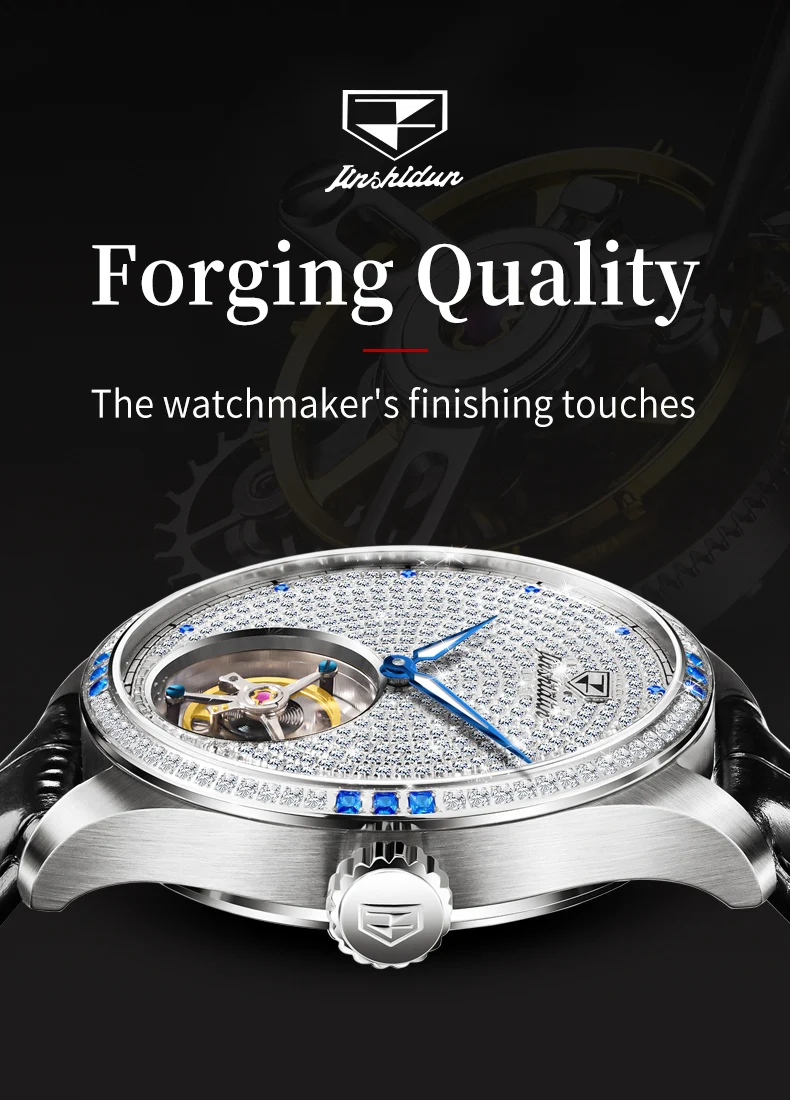 JSDUN Fully Diamond Tourbillon Automatic Watch for Men Genuine Leather Strap Sapphire Mirror Luxury Mechanical Man Wrist Watches