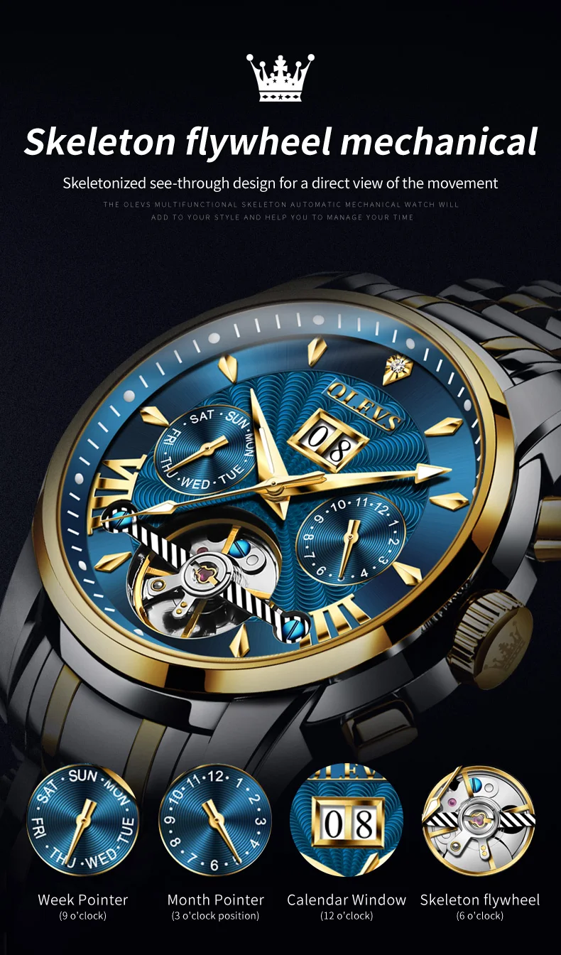 OLEVS Luxury Top Brand Watch for Men Automatic Mechanical Watches Waterproof Stainless Steel Skeleton Design Man Wristwatch