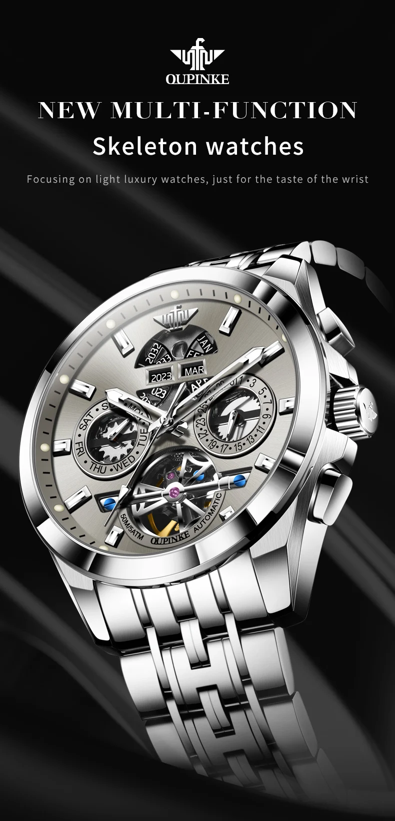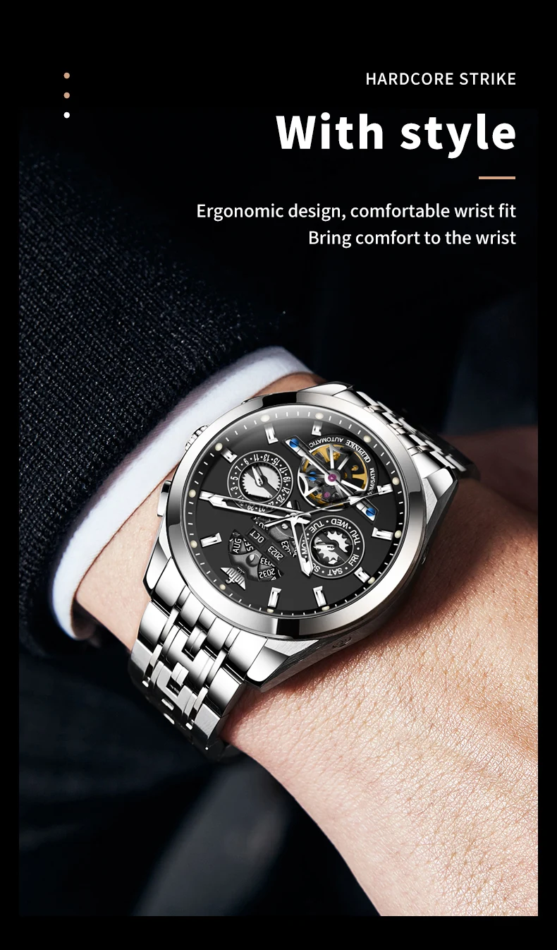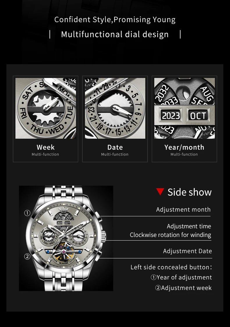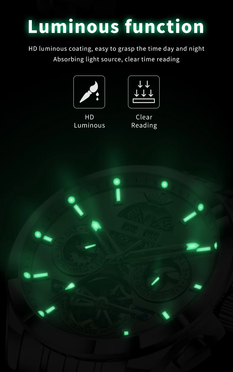 Feature: tourbillon,Skeleton,Luminous,Shock Resistant,Complete Calendar,Week Display,water proof