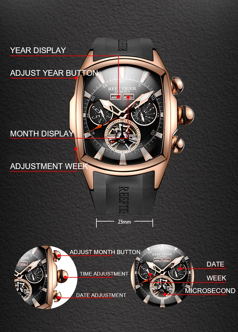 Reef Tiger 316L Stainless Steel Wine Barrel Automatic Watch Fashion Mulitfunction Tourbillon Mechanical Watches for Men RGA3069