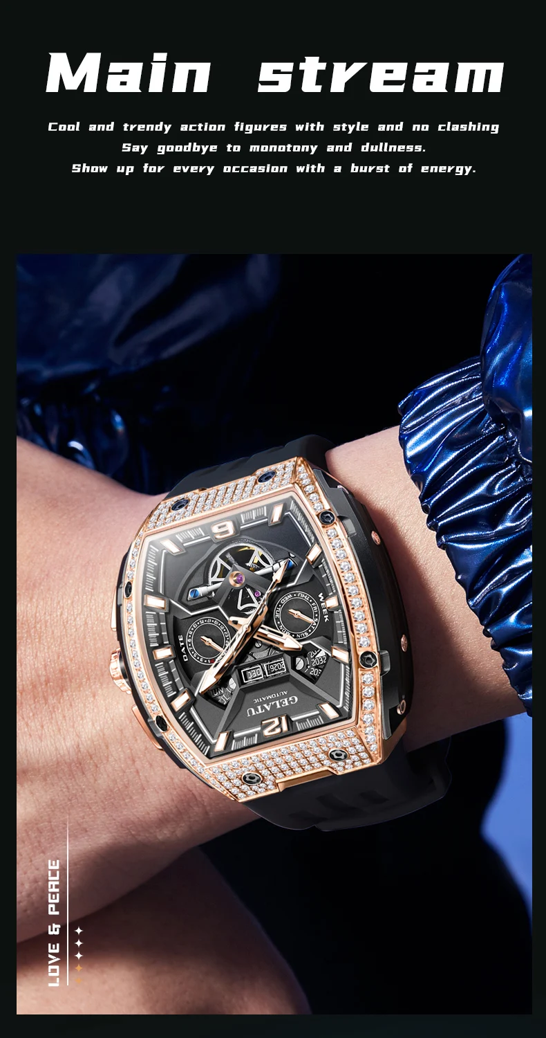 Feature: tourbillon,Skeleton,Luminous,Complete Calendar,Week Display,water proof