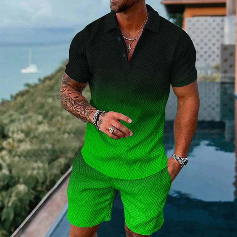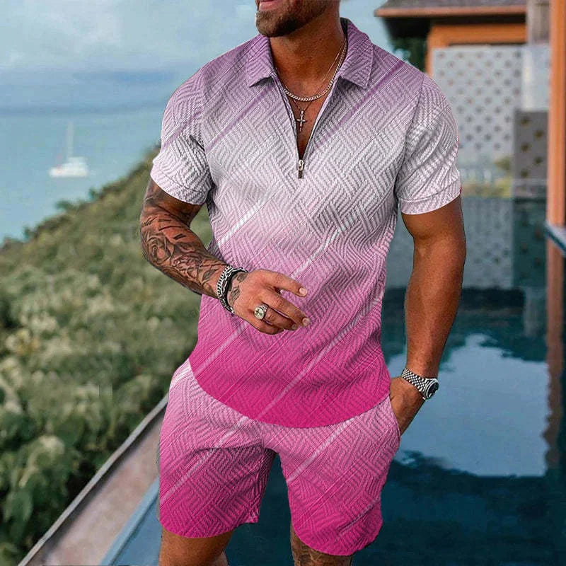 Solid Color Gradient Print Men's Sweatsuit Set Summer Casual Zipper Polo Shirt And Shorts 2pcs Sets Trend Man Pullover Clothing -