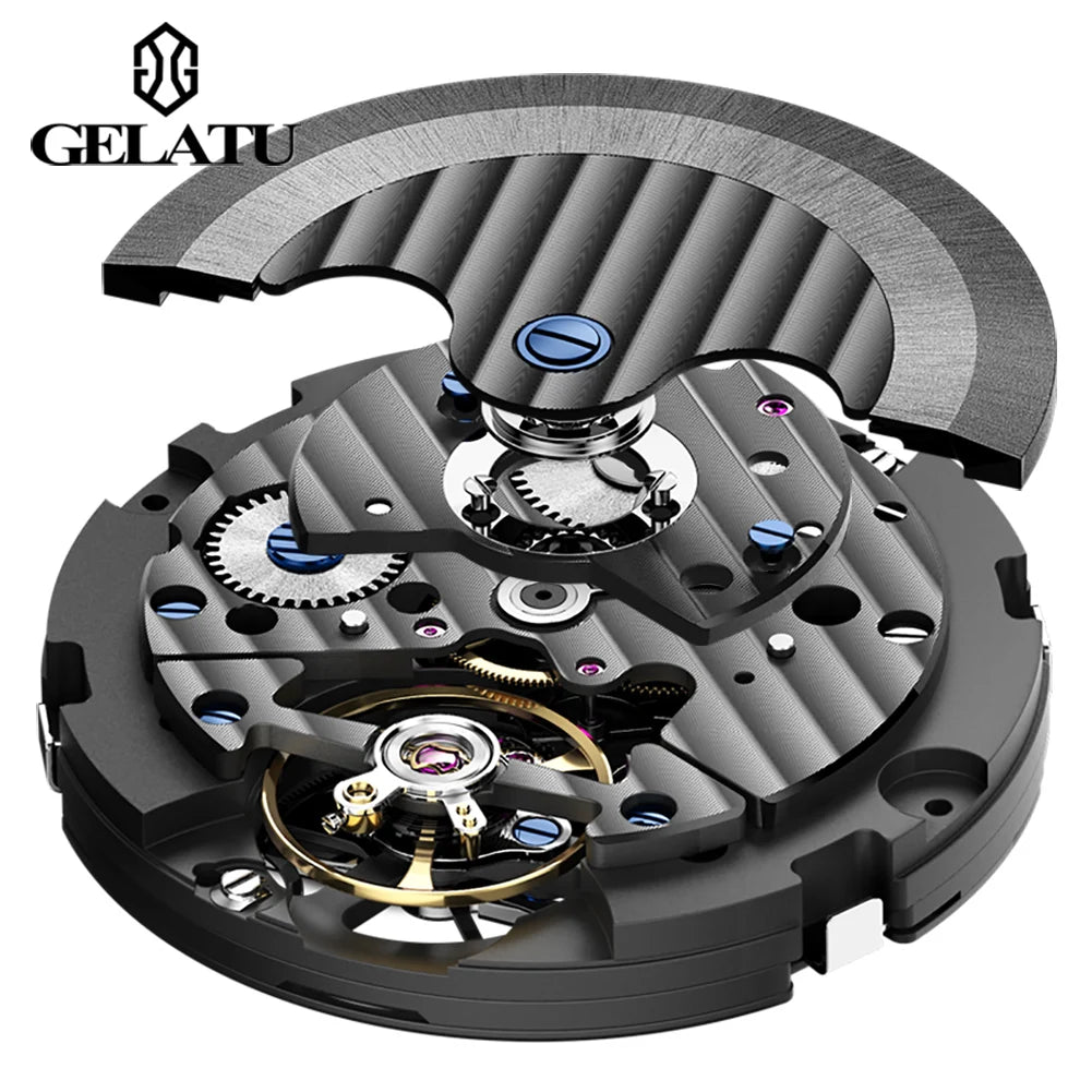 GELATU Top Brand Men's Watches Full Automatic Wristwatch for Man Hollow Mechanical Flywheel Date Week Waterproof Luminous