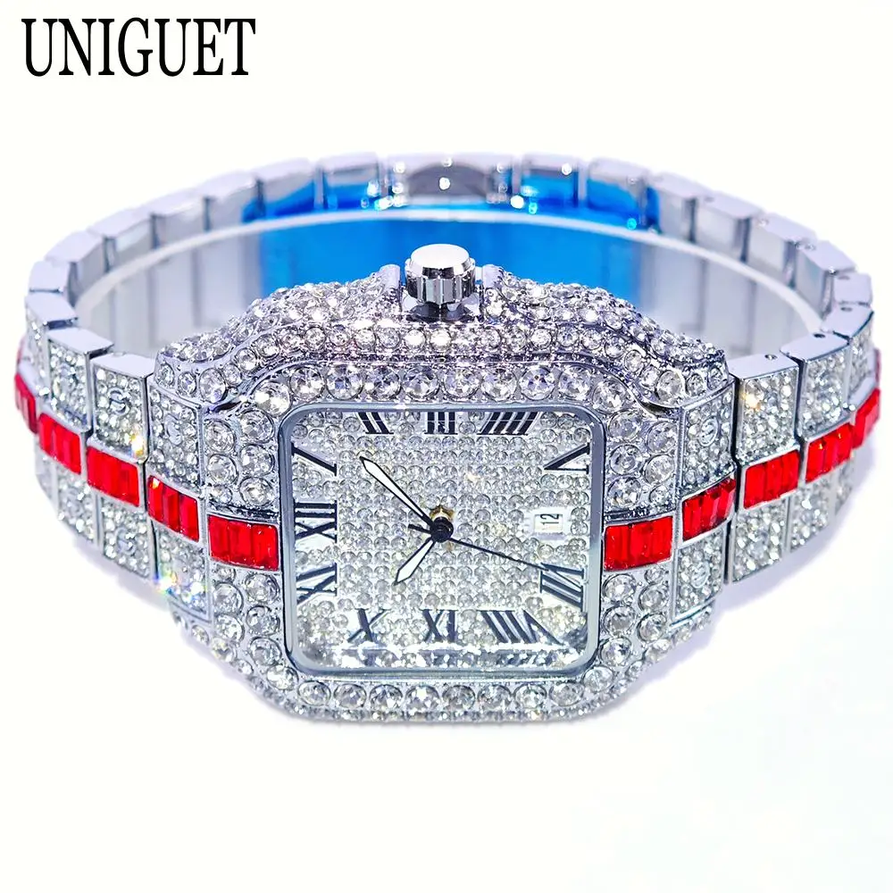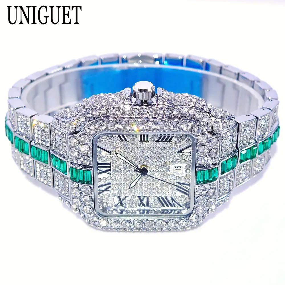 Fashion Watch For Men Brand UNIGUET Luxury Square Iced Out Quartz Watch Man Hip Hop Blue Diamond Jewelry Wristwatch Reloj Hombre
