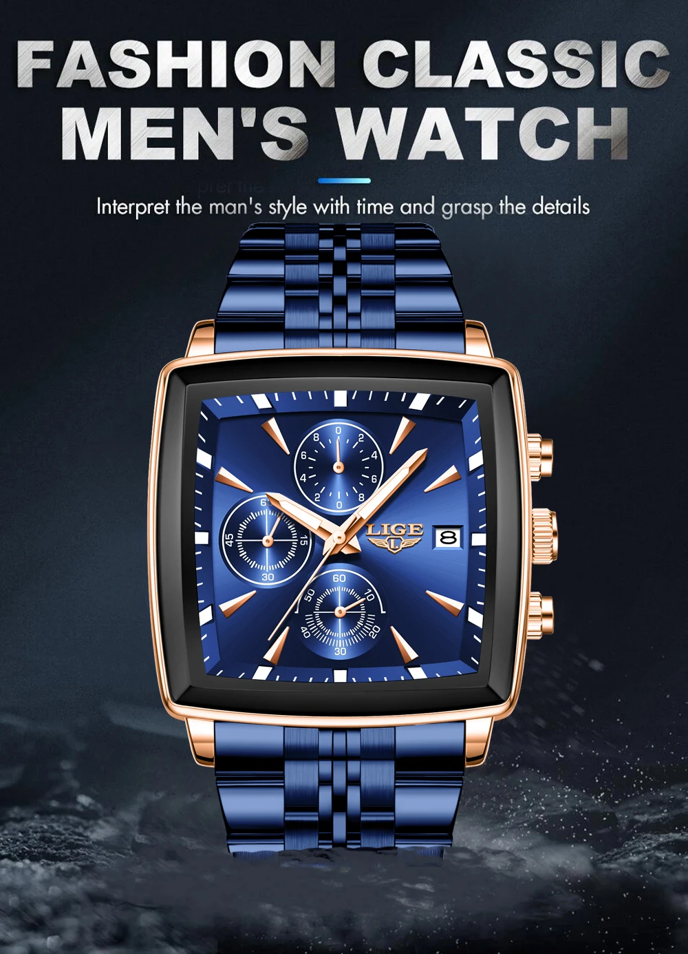 LIGE Top Brand Luxury Mens Watches Fashion Military Square Chronograph Quartz Wristwatches For Men Sports Waterproof Watch Men