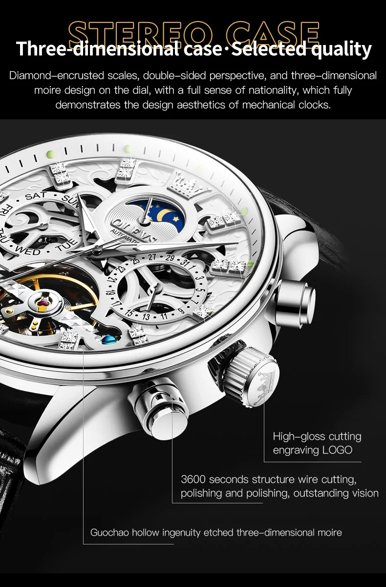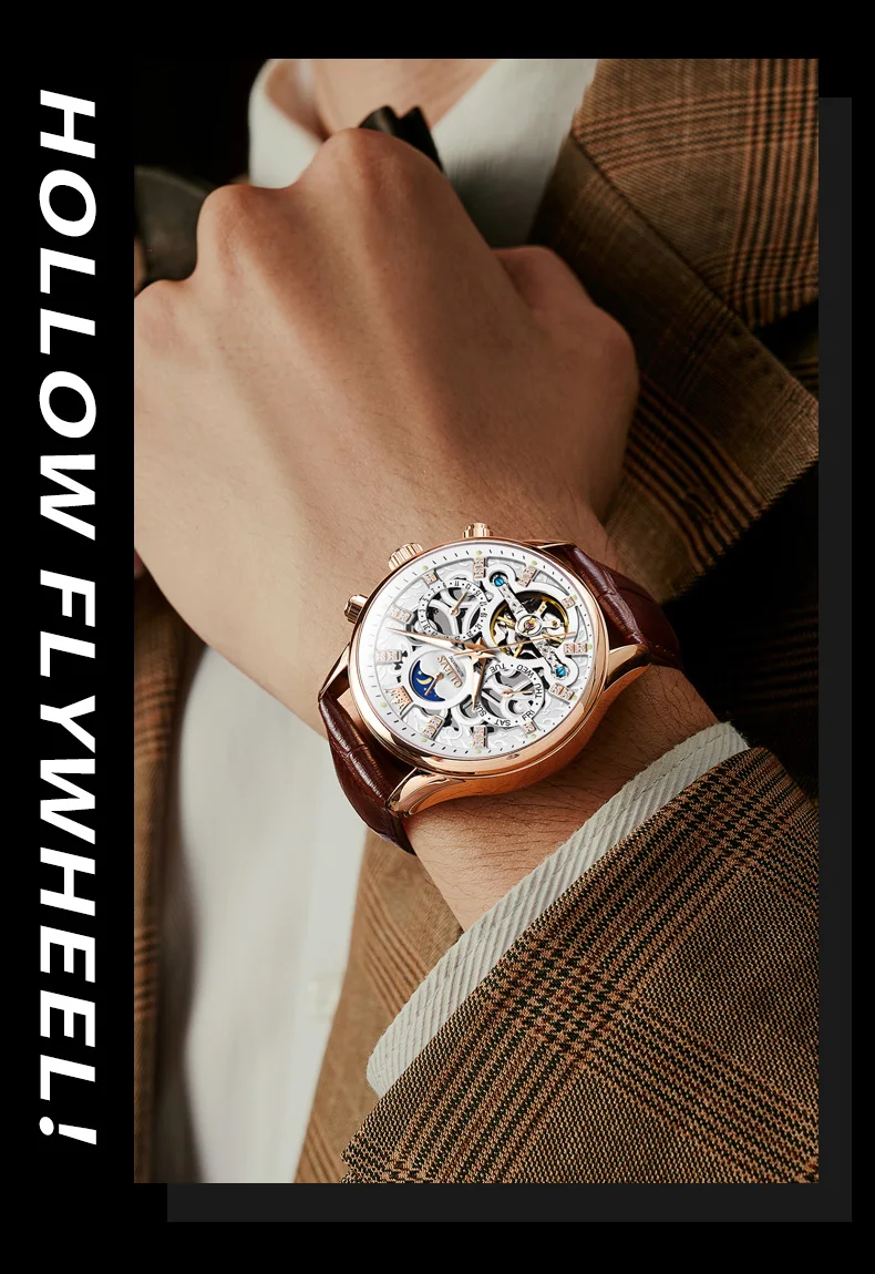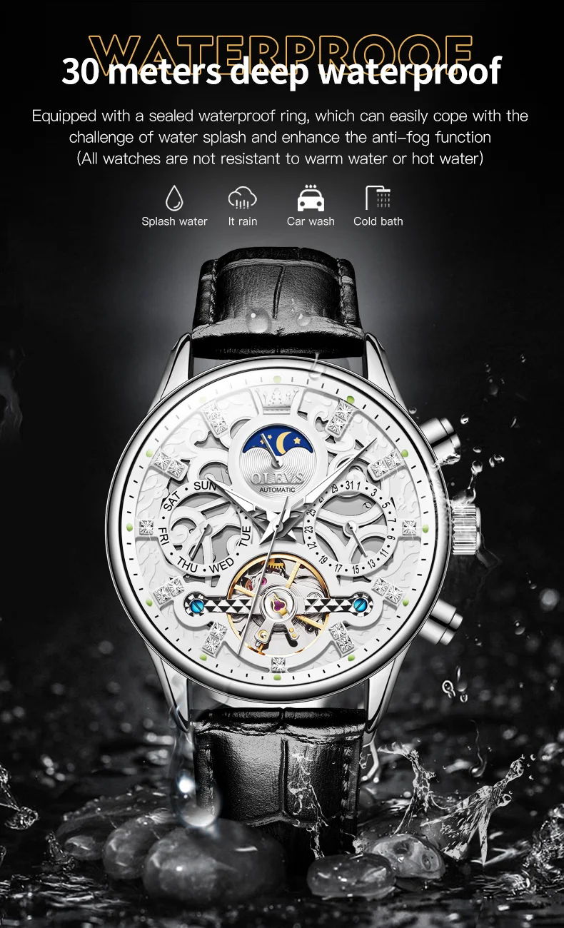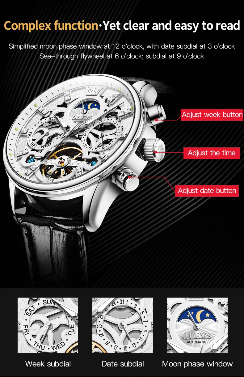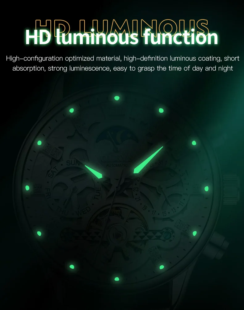 Feature: Skeleton,Luminous,Shock Resistant,Complete Calendar,Moon Phase,Week Display,water proof