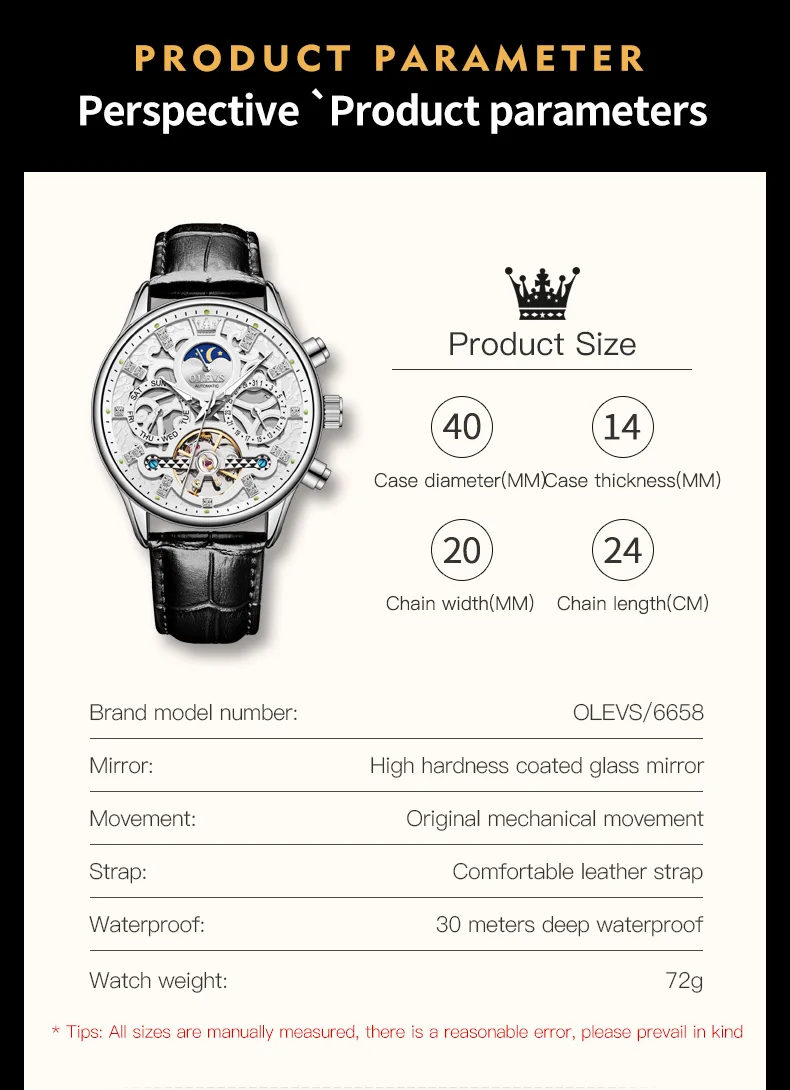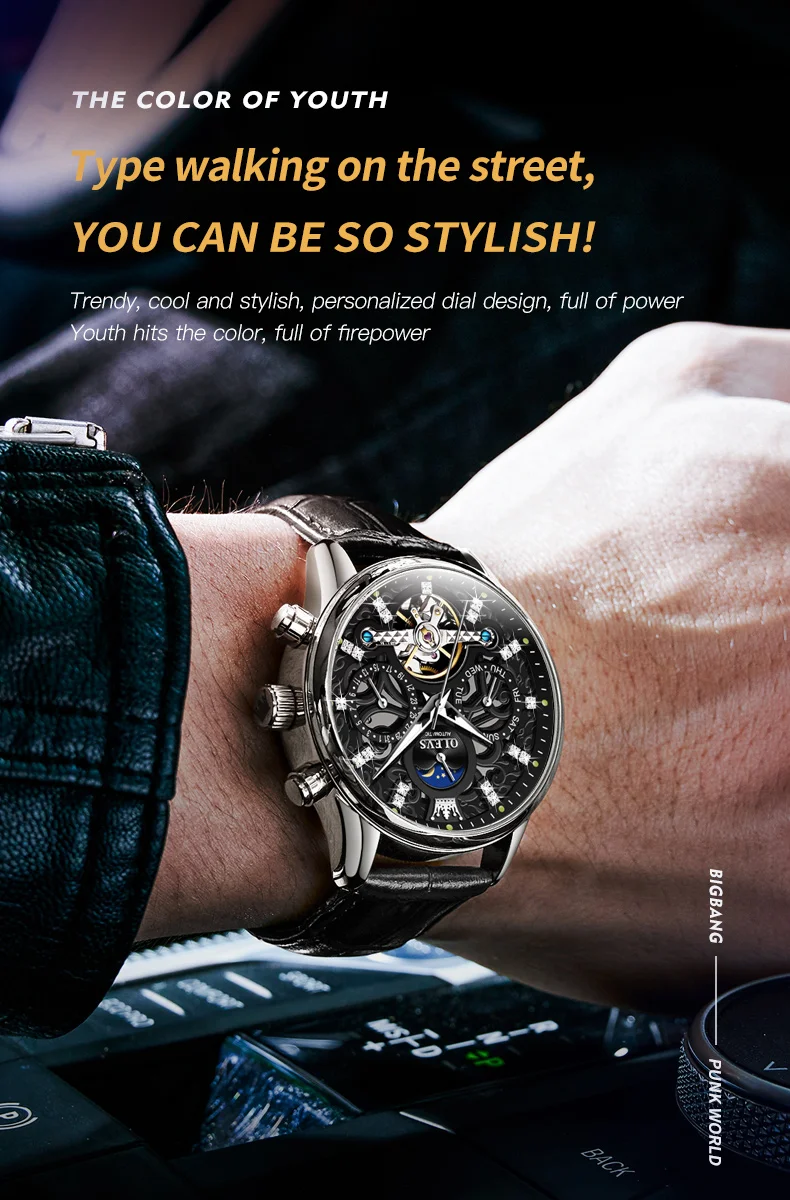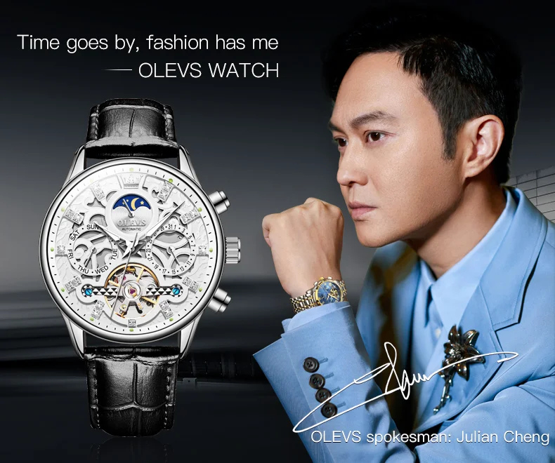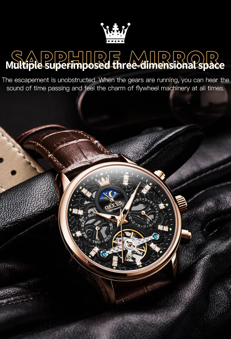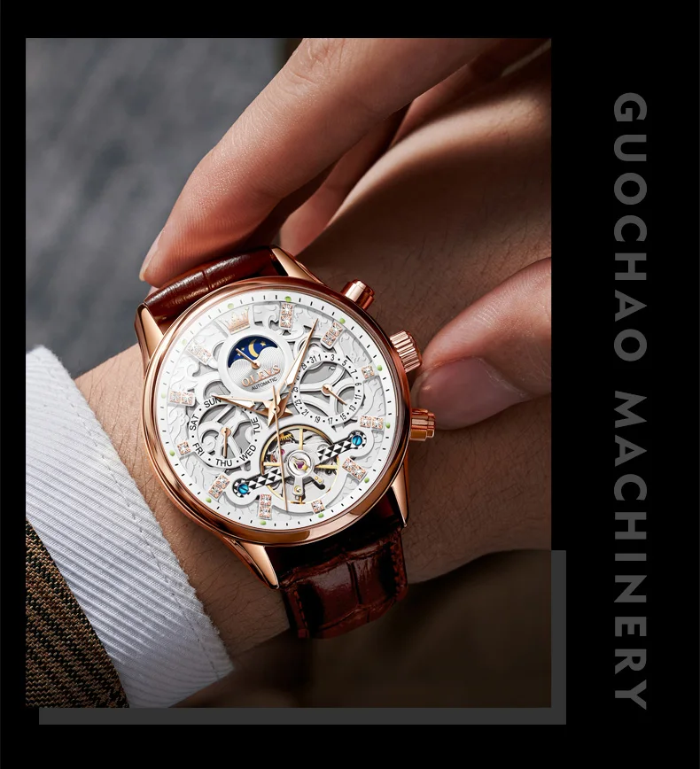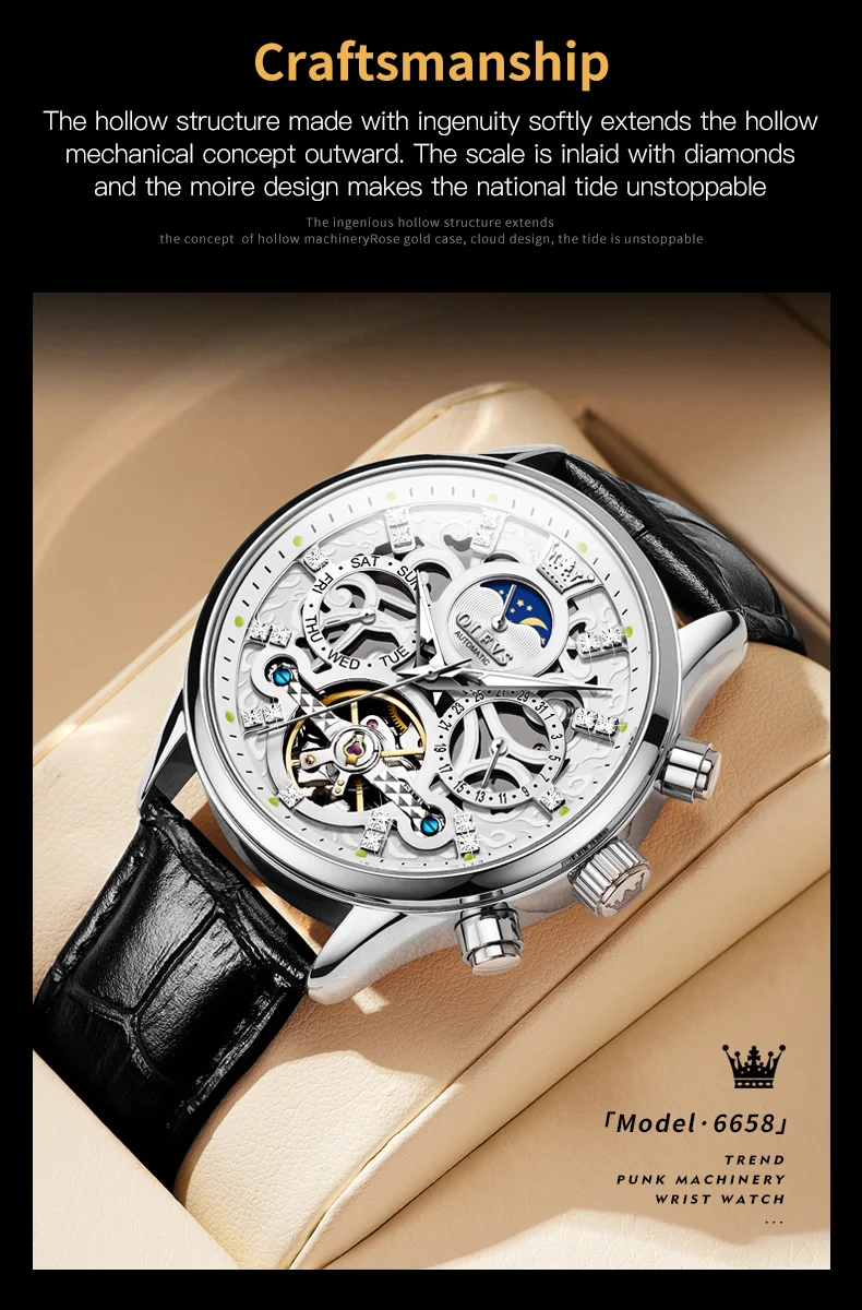 OLEVS 6658 Automatic Watches for Men Leather Strap Moon Phase Men's Hollow Mechanical Wristwatch Waterproof Calendar Hand Clock