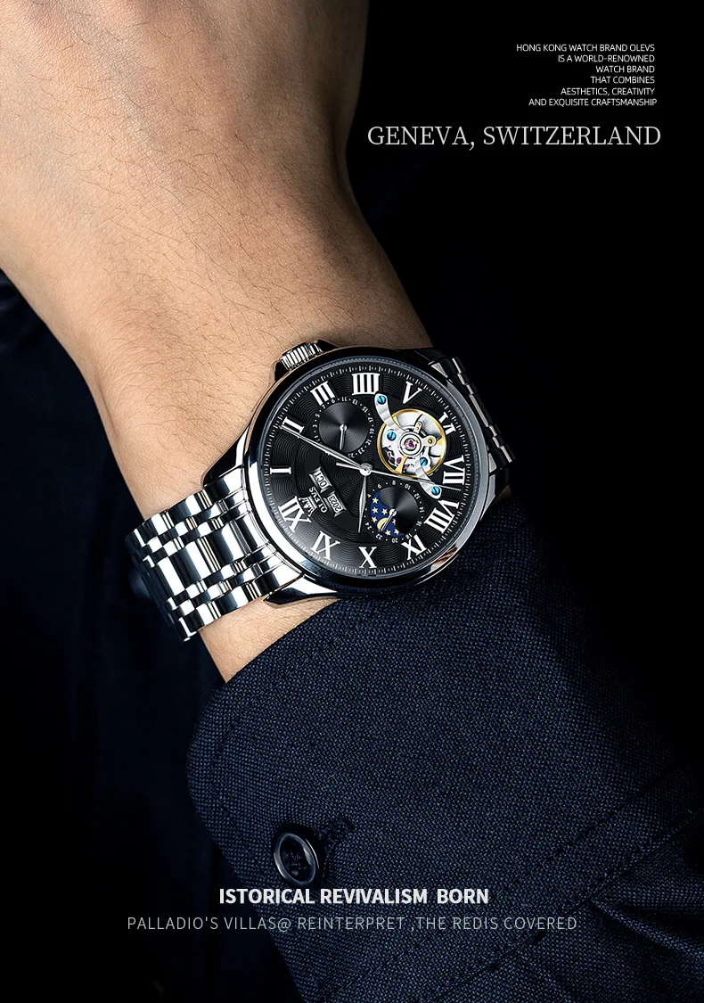 OLEVS 7013 Men's Watch Fashion Moon Phase Mechanical Watch For Men Waterproof Roman Scale Hollow Flywheel Automatic Hand Clock