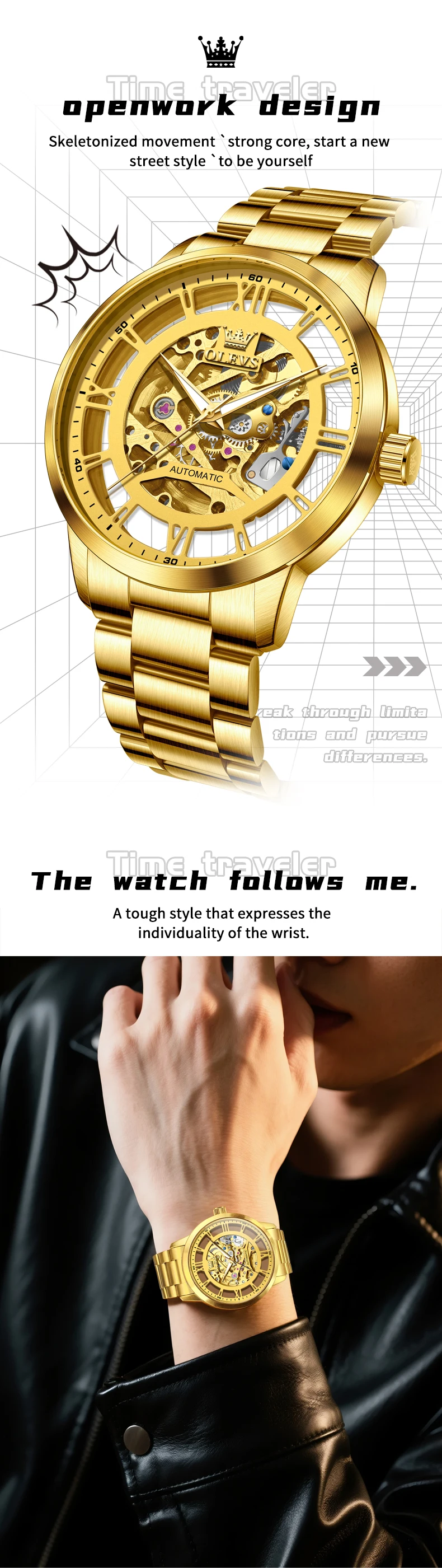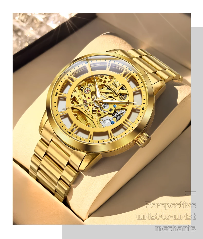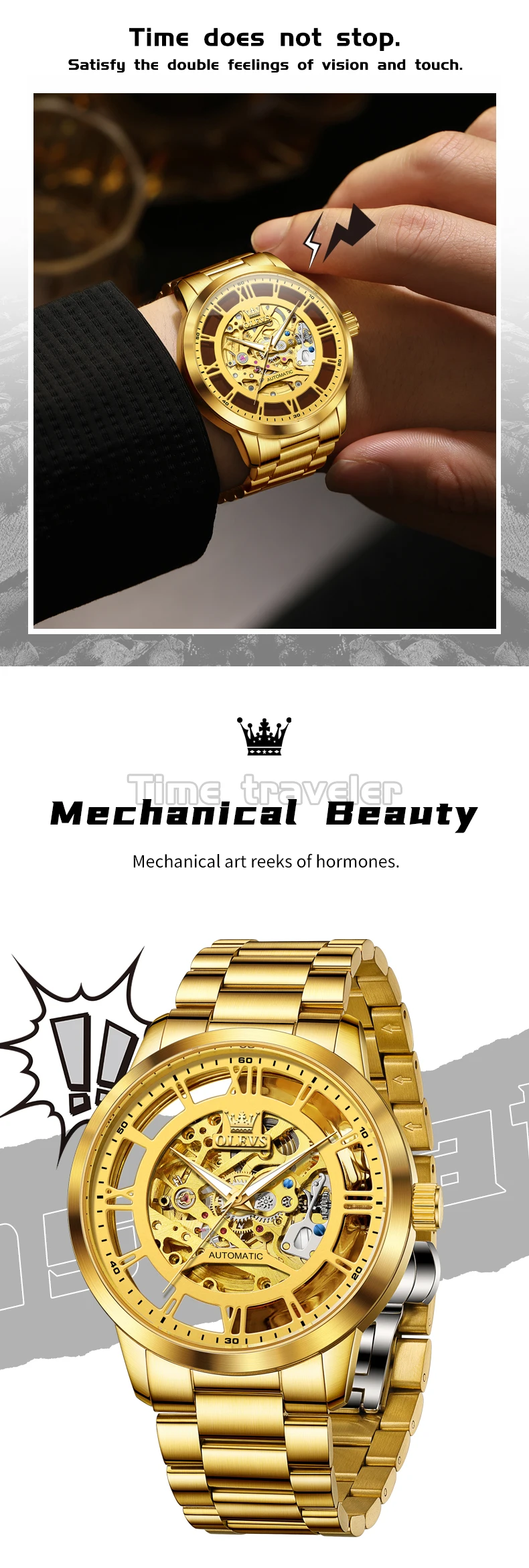 OLEVS Men Gold watch Skeleton Luxury Watch automatic mechanical Classic Wristwatches For Men Waterproof High Quality 6728
