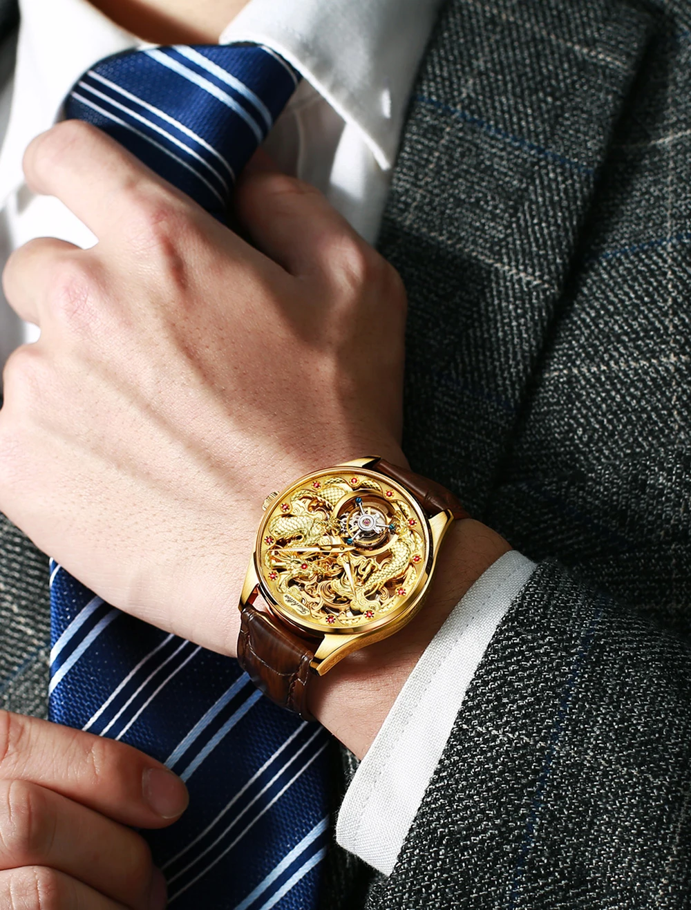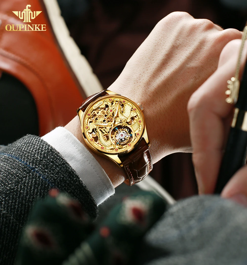 OUPINKE 3176 Top Brand Tourbillon Watch for Men Original Leather Strap Golden Dragon Design Automatic Mechanical Movement Wristwatch