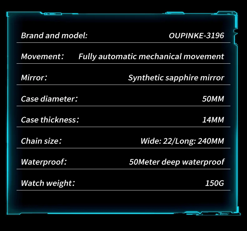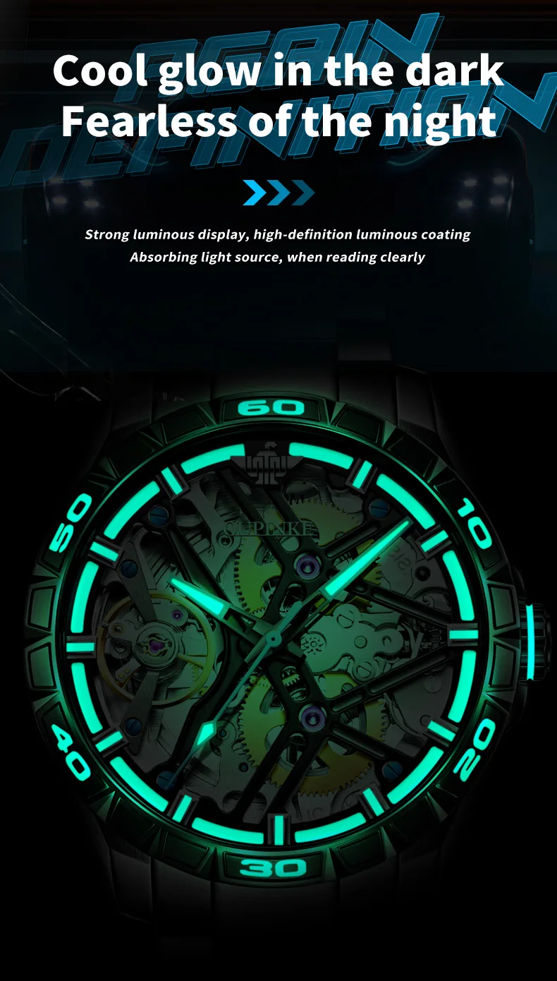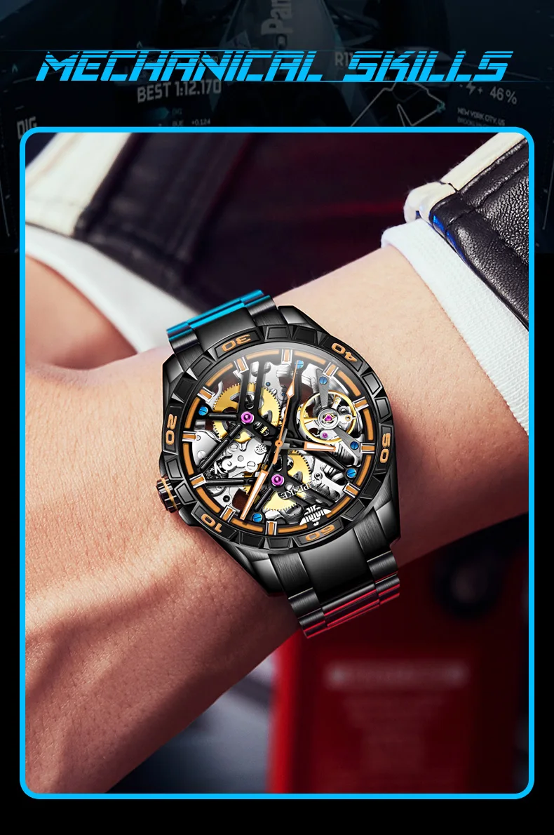 OUPINKE 3196 Blue Watch for Men Original Automatic Movement Deep Waterproof Hollow Out Mechanical Wristwatch Men