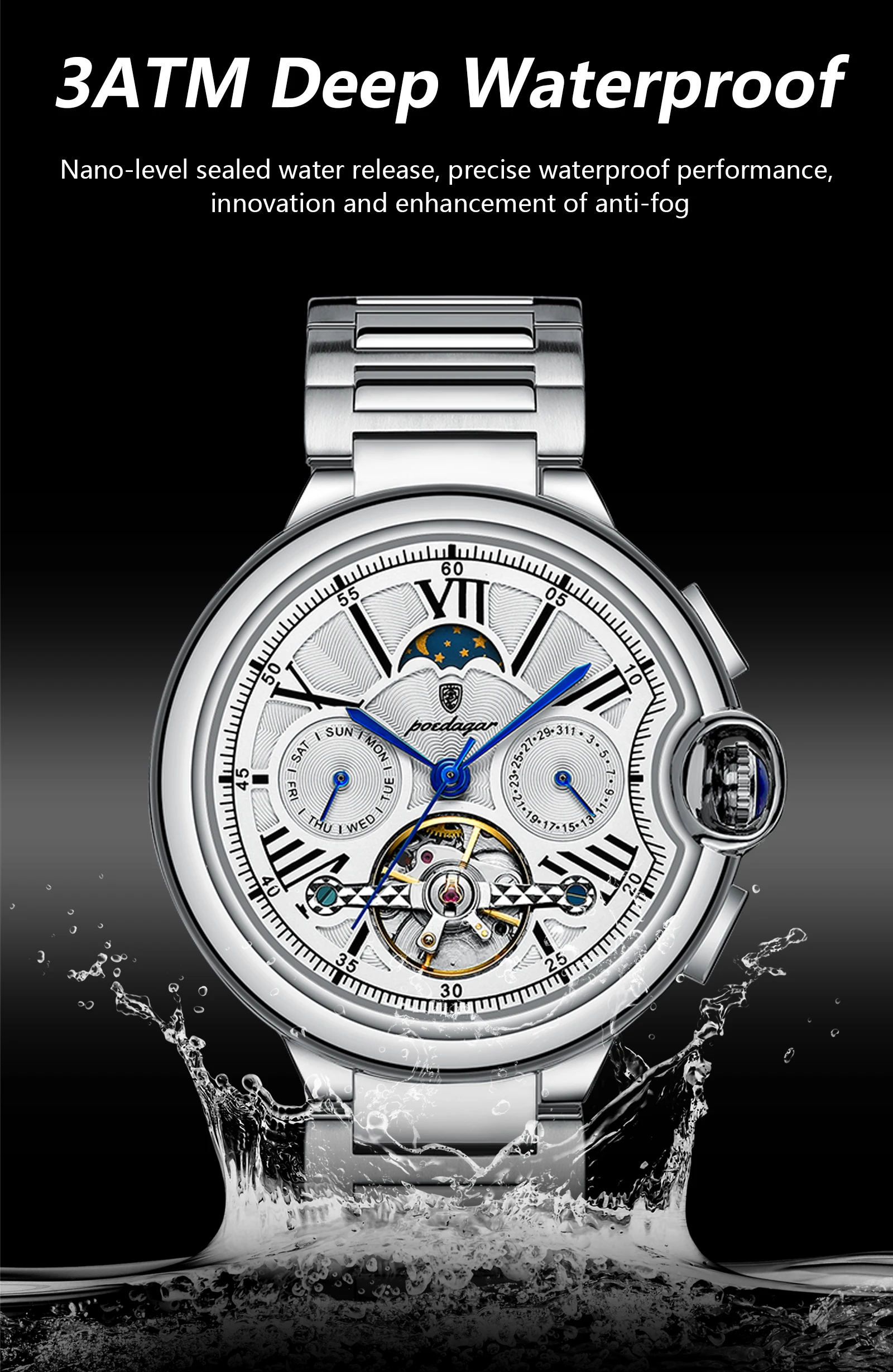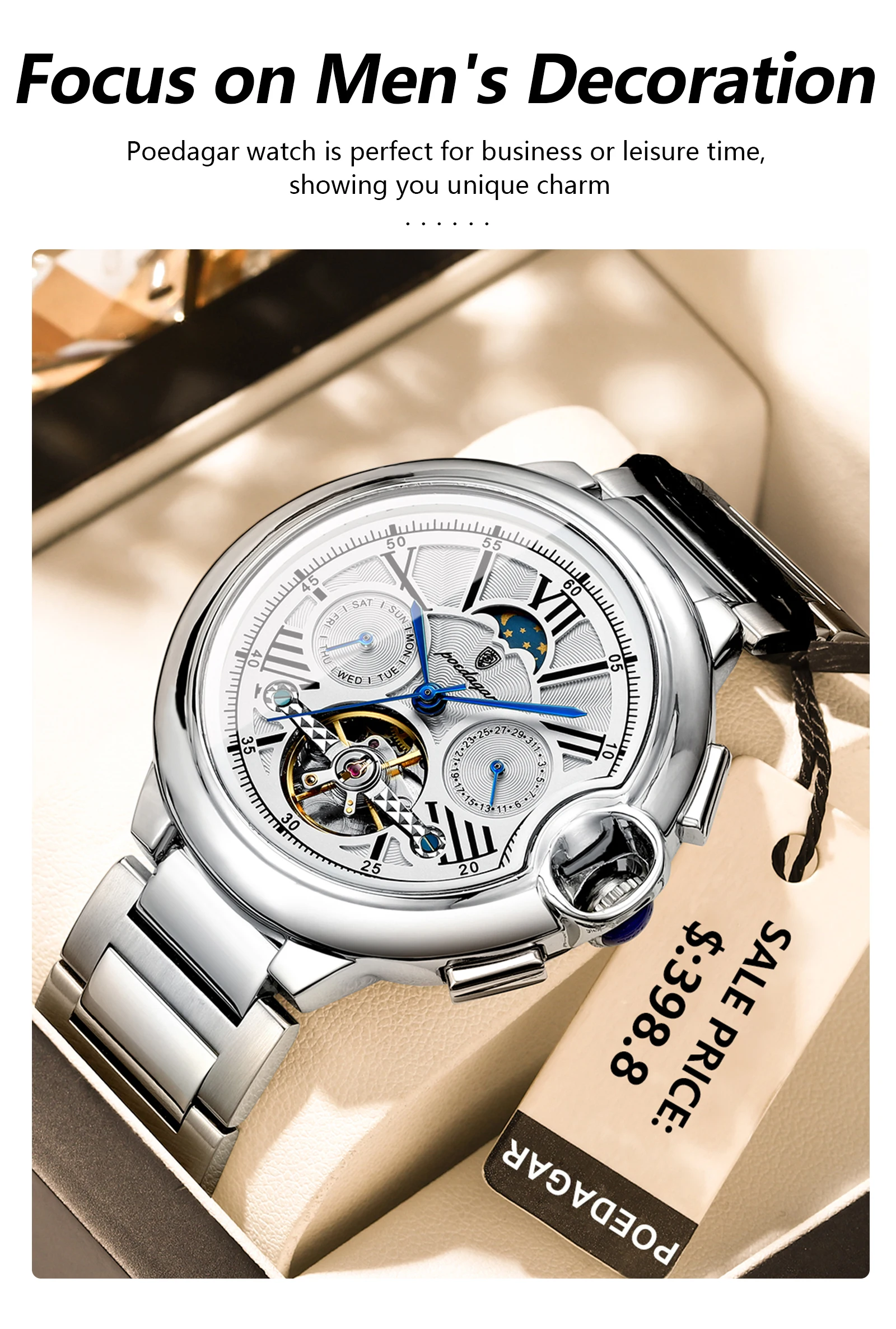 POEDAGAR Luxury Man Watch Tourbillon Date Week Stainless Steel Men Watch Waterproof Automatic Mechanical Military Men's Watches