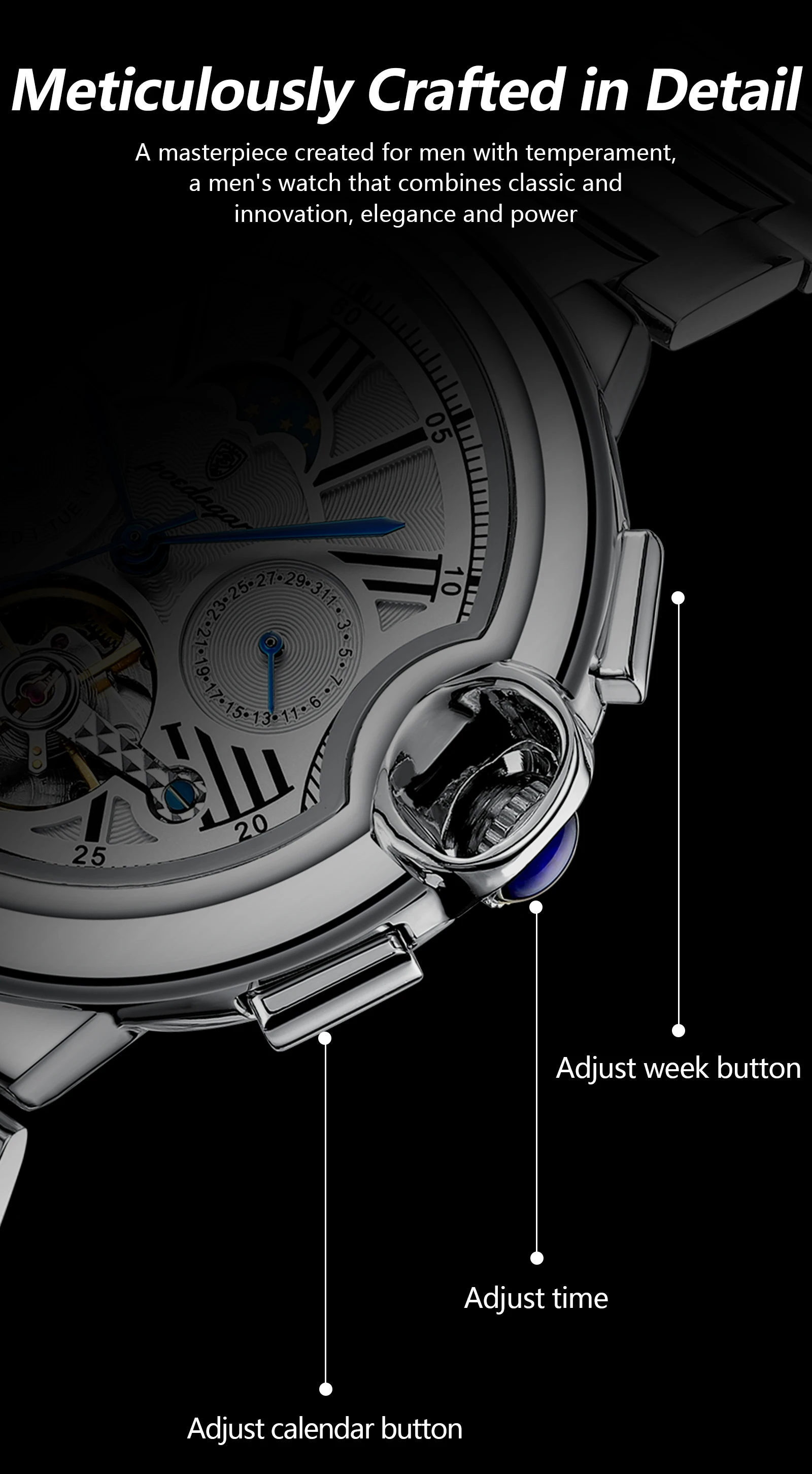 Feature: tourbillon,Skeleton,Complete Calendar,DIVER,Moon Phase,Week Display,water proof