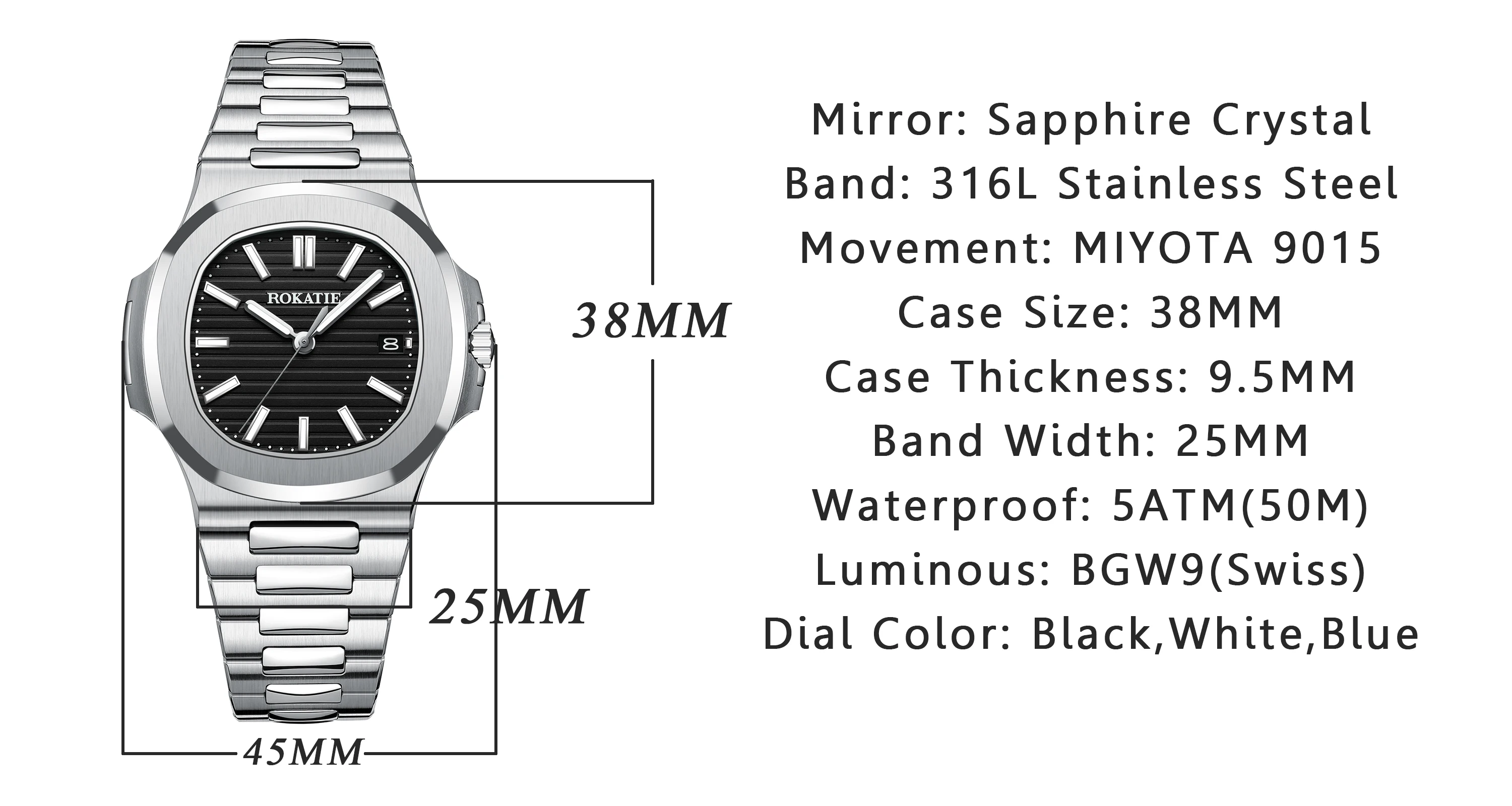 ROKATIE Mechanical Watches Luminous Needle Stainless Steel 316L 9015 Movement Automatic Watch 5ATM Waterproof Automatic Watch